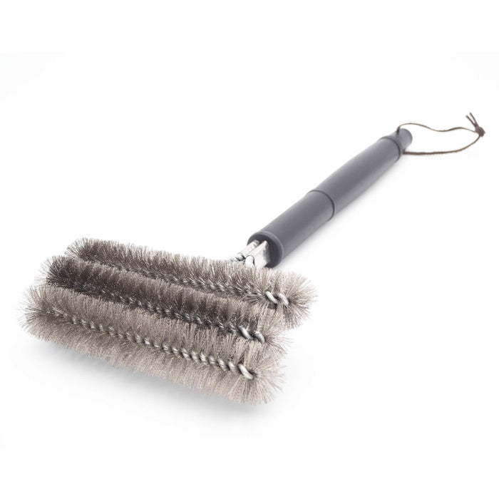 Die 43 cm lange Grillbürste von ALLGRILL überzeugt durch ihren innovativen 3-fach Edelstahlbürstenkopf, der quer angeordnet und flexibel federnd ist. Dadurch passt sich die Bürste optimal jedem Grillrost an und erreicht mühelos schwer zugängliche Stellen zwischen den Roststäben.